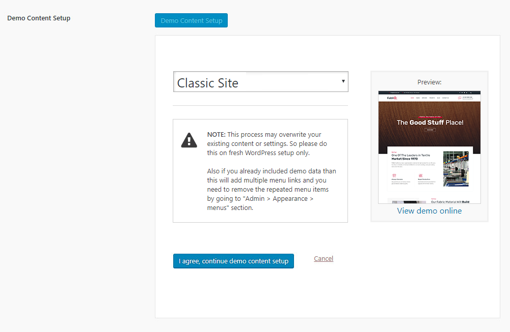 Now click on the I agree, continue demo content setup button and the installation process will start (this process may take 5 or 10 minutes depends on your server performance):