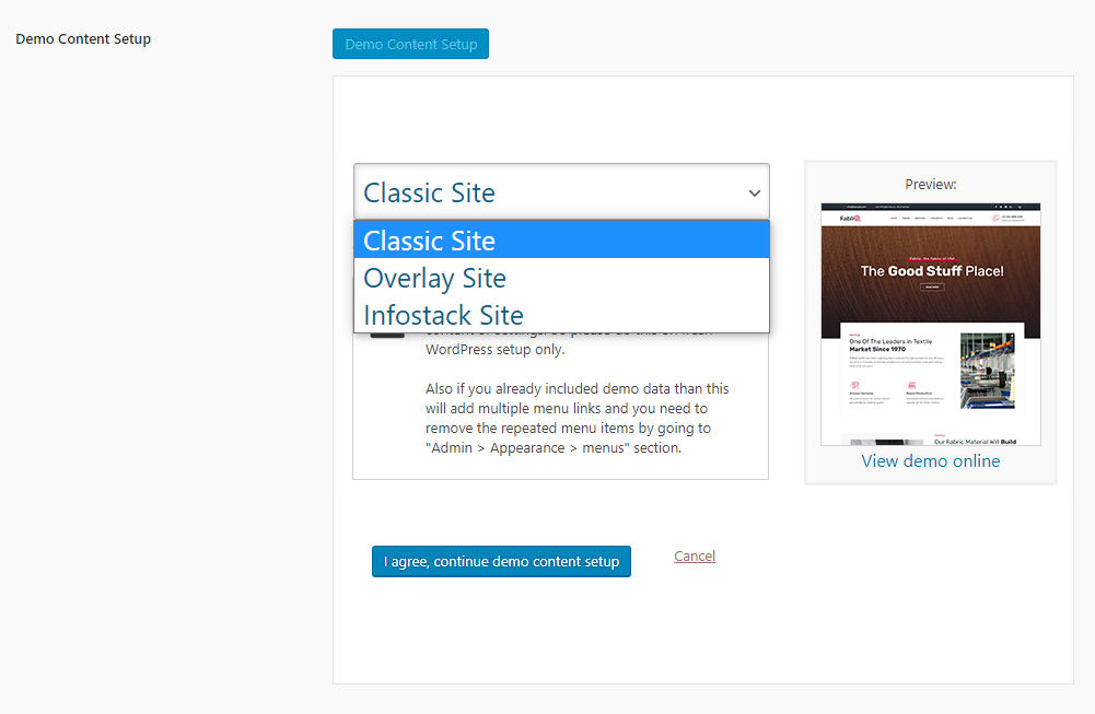 You can select which demo you like to setup. Like Default, Classic, Elegant etc. Just select it from dropdown as described below: