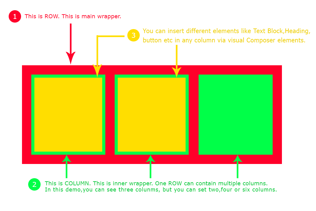“Row“ is the main content element of Visual Composer. Rows are used to divide your page into the logic blocks with columns, columns later will hold your content blocks. Rows can be divided into the layouts (eg. 1/2 + 1/2, 1/3 + 1/3 + 1/3, and so on). Your page can have unlimited number of rows. To change row's position, click and drag row's drag handler (top left row's corner) and drag row around (vertical axis). Please see below screenshot: