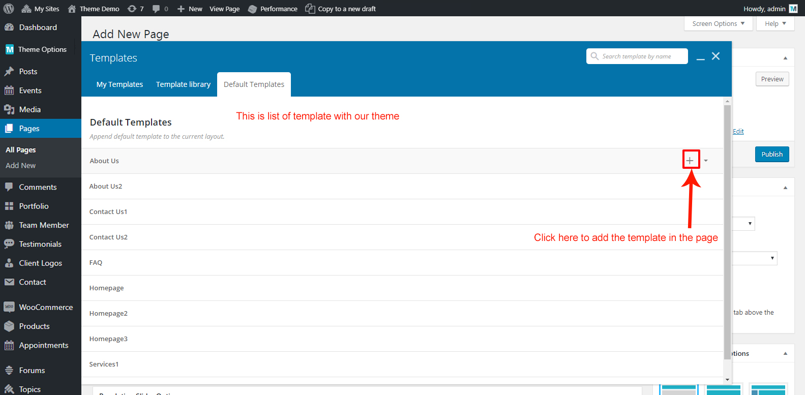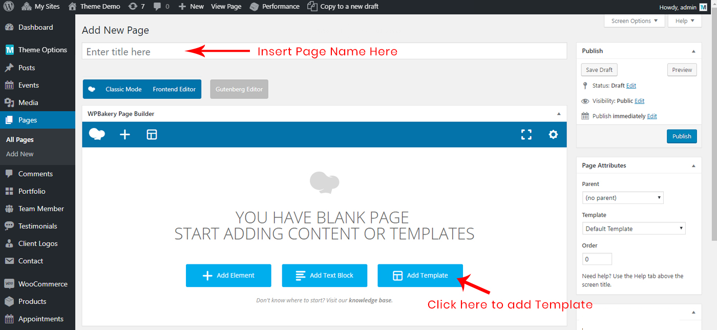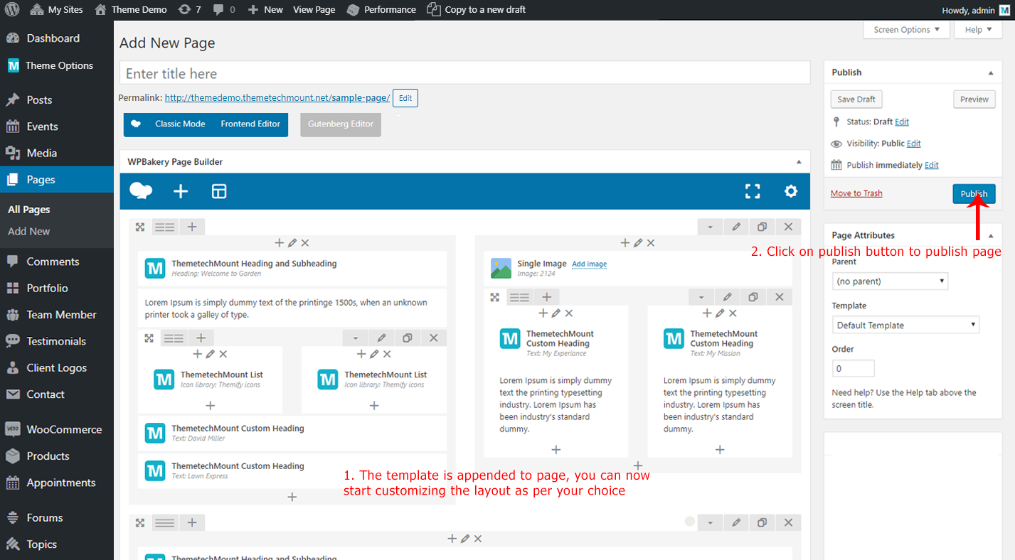 You can create new page on your site from Admin > Pages section. You can start creating any layout of your choice with Visual Composer page builder. Also we are providing some predefined Page Templates to get exact look as some of our pages shown on our demo site. We will discuss more on this below at Visual Composer Templates.
