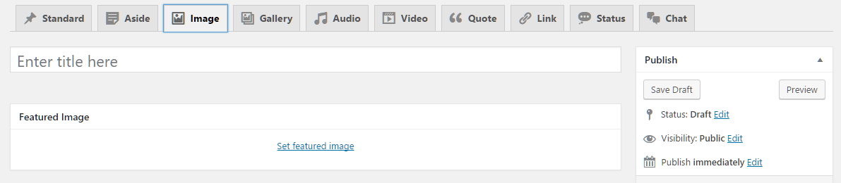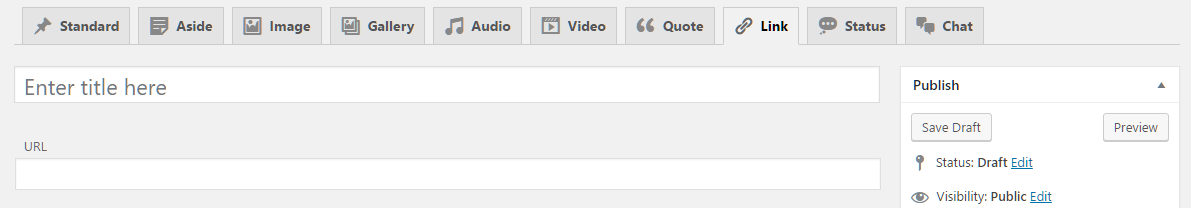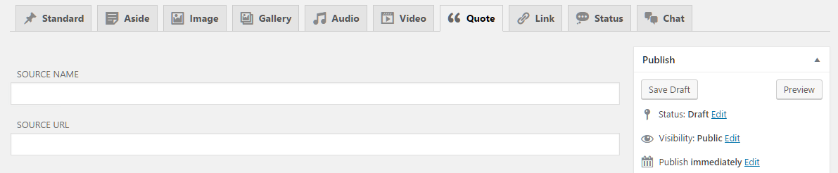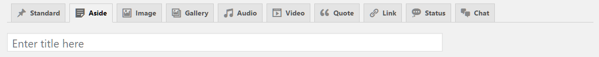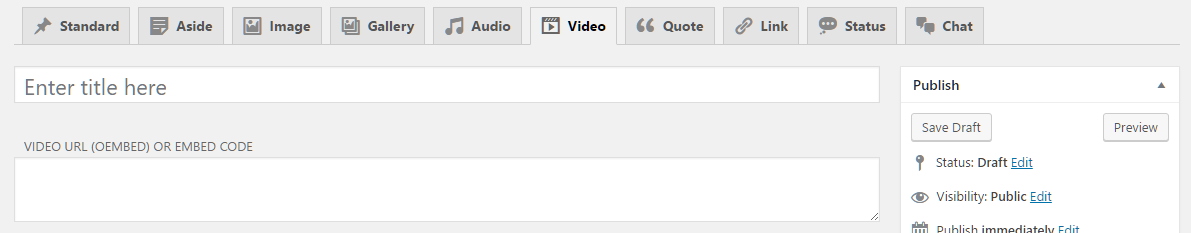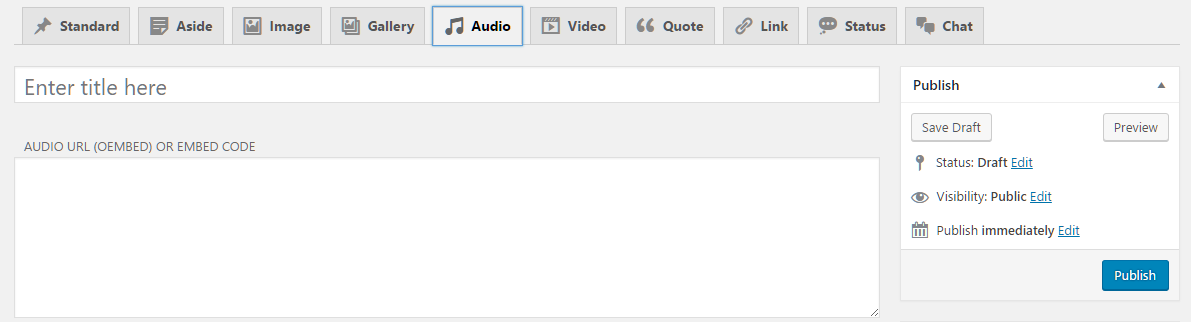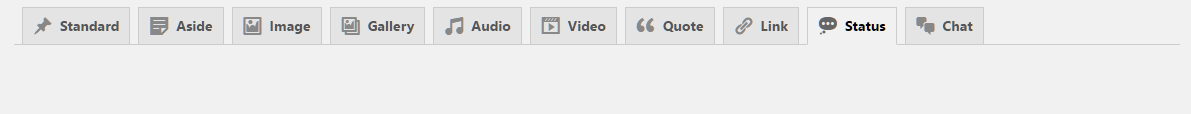Fablio theme supports 10 post formats. You will see all Post Formats as tabs to select. If you can't see tabs than please install CF Post Formats plugin. Here are list of all supported post formats with details:
