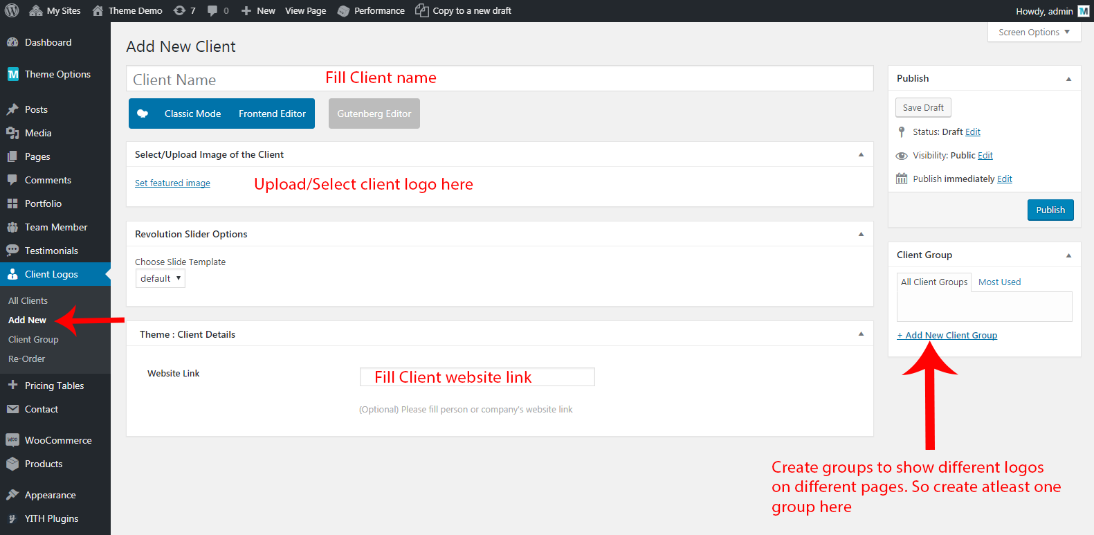 To setup Client Logos, first you need to add some entries with photos and texts. Go to "Client Logos" section and click "Add New". Fill details as described in below screenshot: