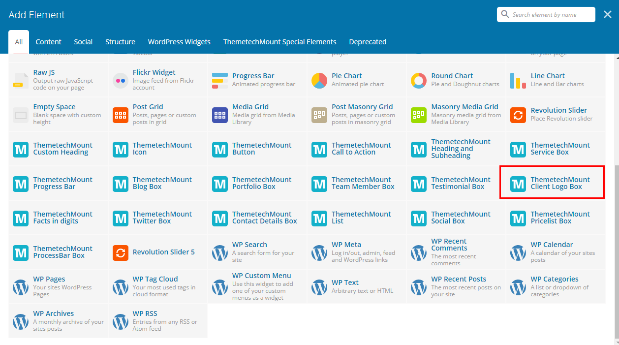 Now we need to create a new page to show Client Logos. The option is included in "Visual Composer" plugin (Make sure you installed Visual Composer plugin). Go to Pages >> Add New and click on "Add element" button: