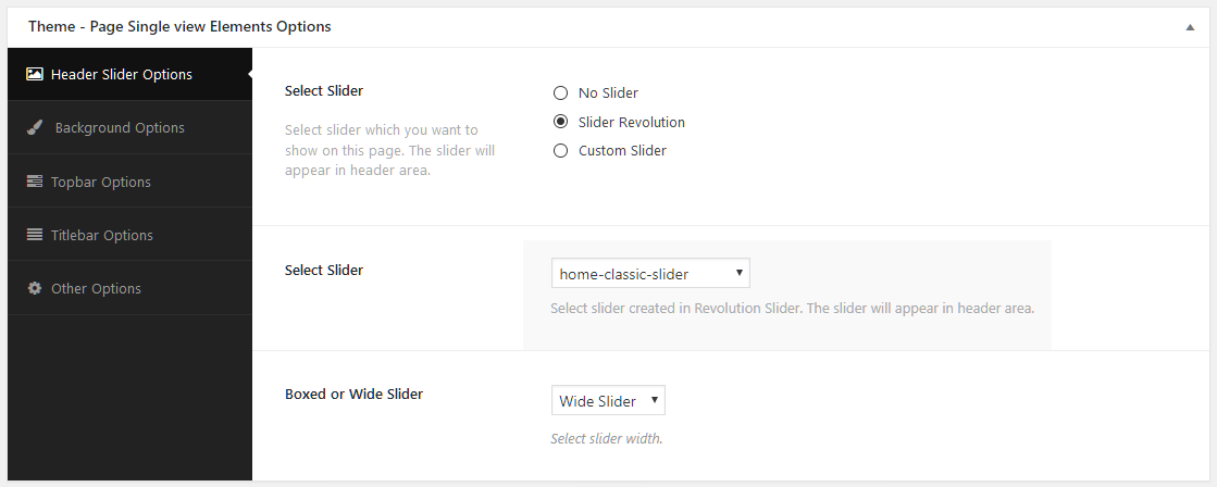 - Select Slider Type: Select slider which you want to show on this page. The slider will appear in header area. When you select "Slider Revolution" than it will show you dropdown of the slider you created in "Revolution Slider". When you select "Nivo Slider" or "Flex Slider" than it will show you dropdown of the slider group you created.