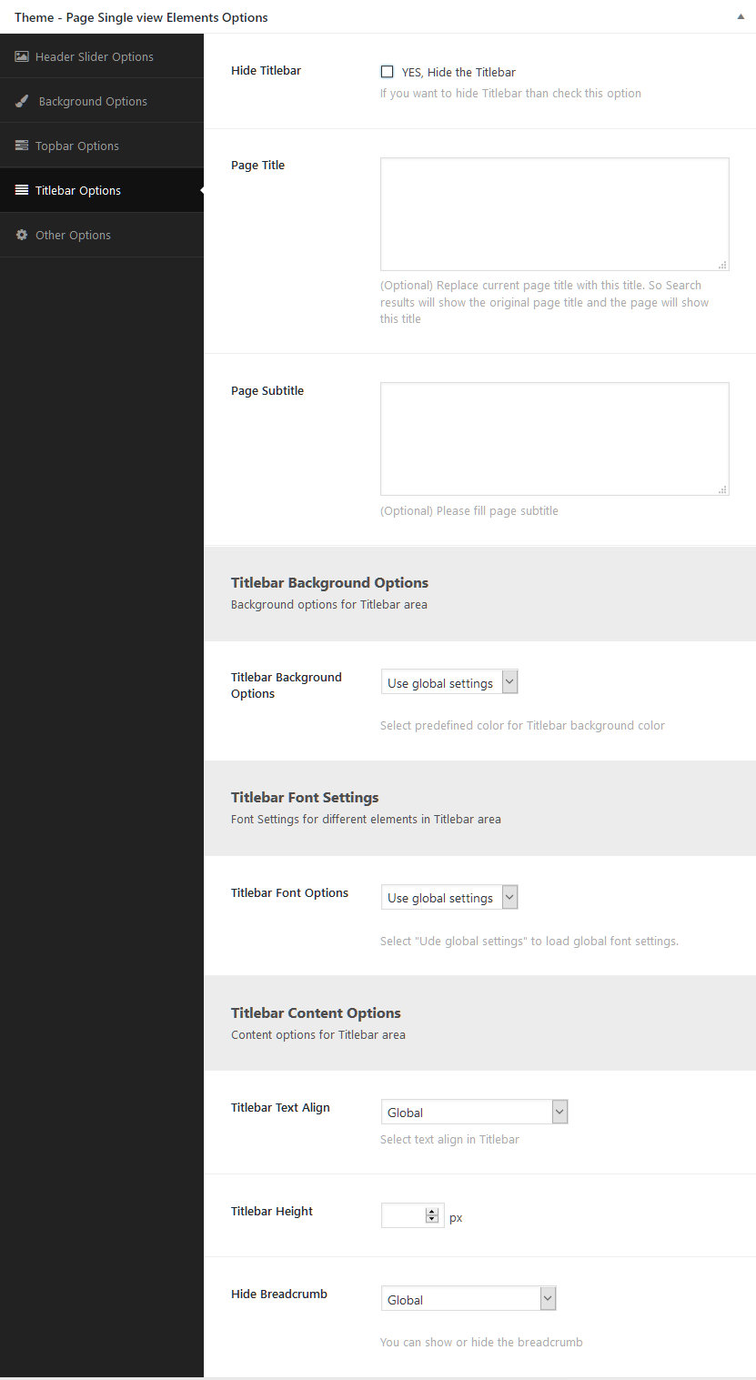 - Titlebar Height: Set height for Titlebar. You can change global options for this.