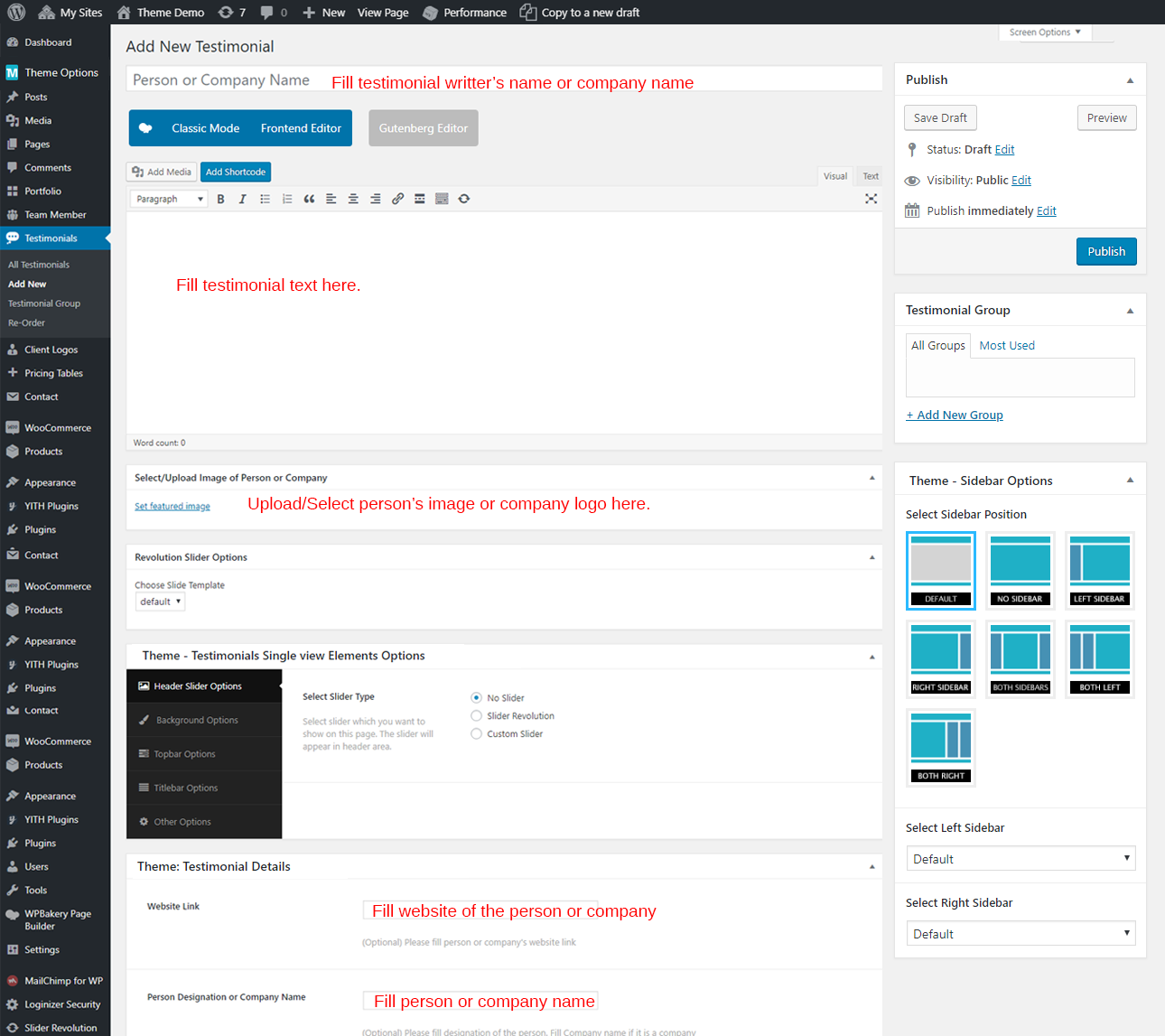 To setup Testimonials, first you need to add some entries with photos and texts. Go to "Testimonials" section and click "Add New". Fill details as described in below screenshot: