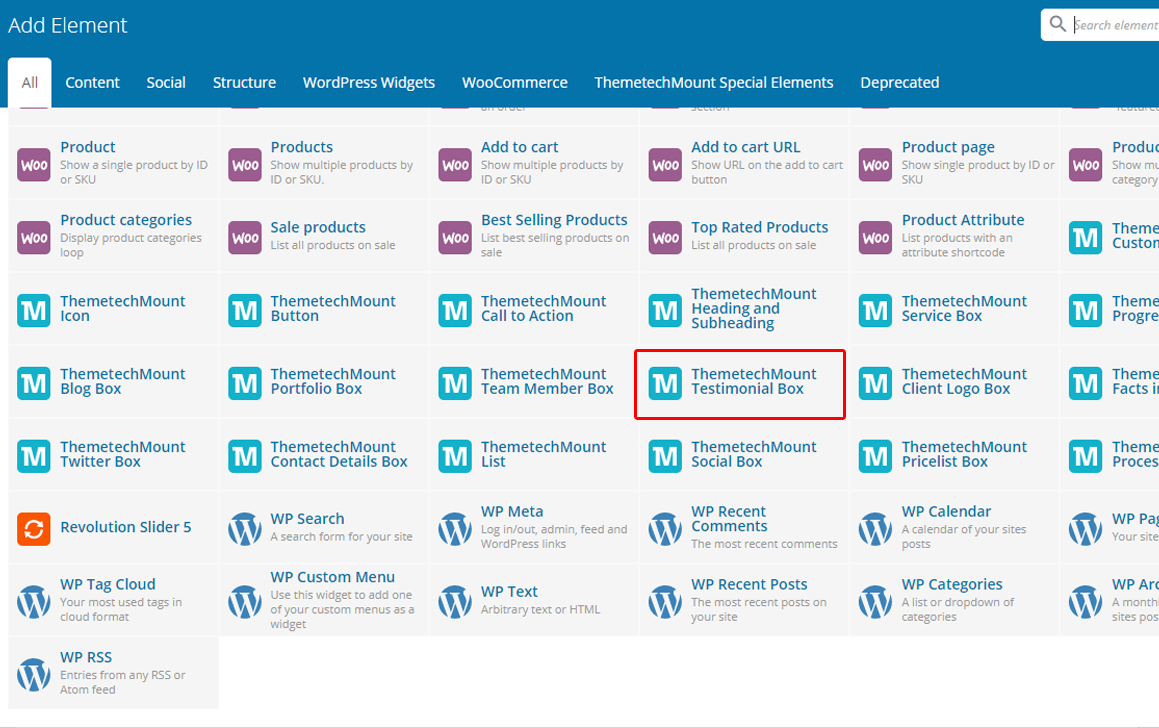 You will see all Visual Composer elements. Click on ThemetechMount Testimonial Box option: