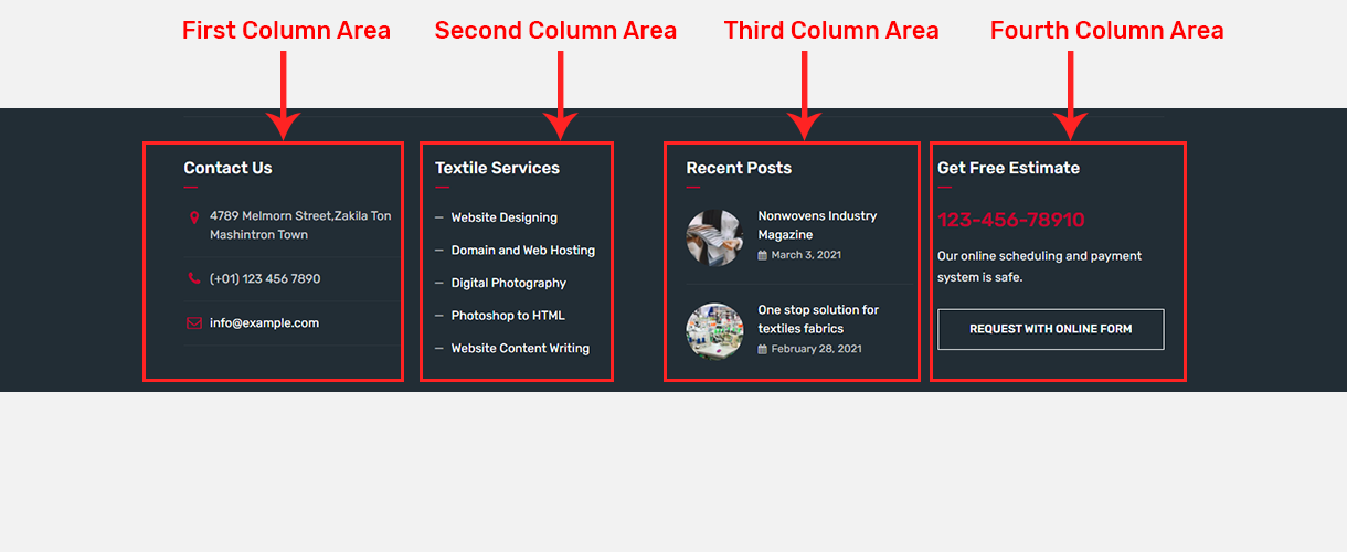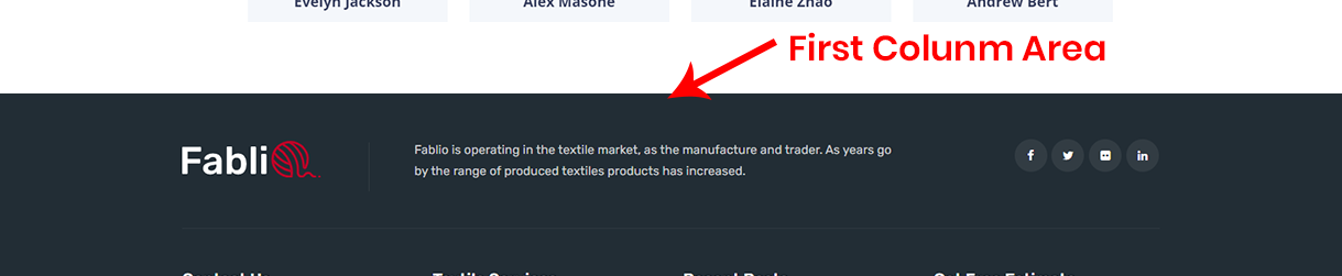 - First Footer - 1st Widget Area: This will be shown as 1st column in 1st row of footer area. You can set how many columns you like to show from "Fablio Options > Footer Settings" section.