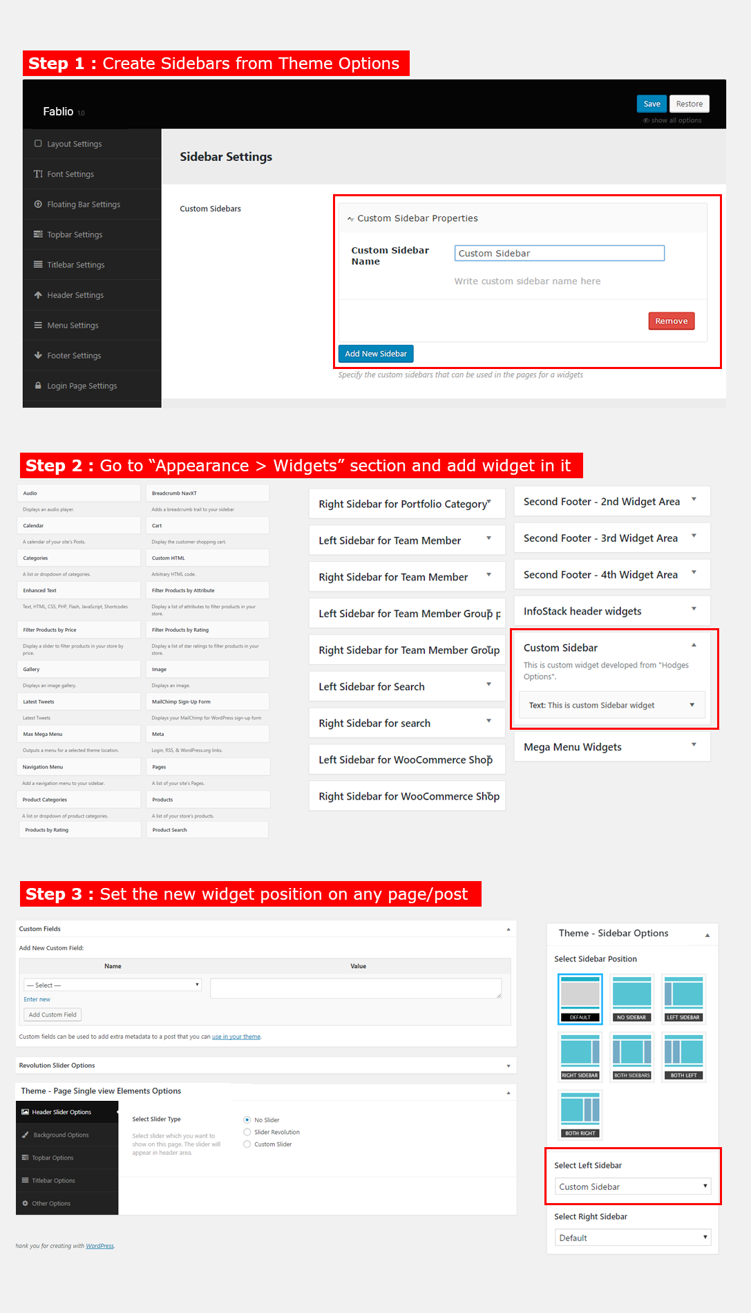 - Left Sidebar For Portfolio: You can add Widgets that you want to display as Left sidebar for single Portfolio that you created from Portfolio section.